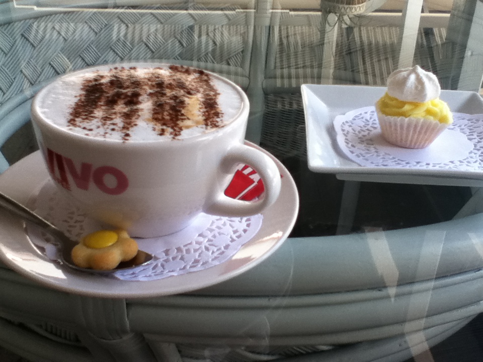 …and here’s the food.. a mini lemon meringue cupcake, a cappuccino Β – and look at the gorgeous mini bikkie on the spoon!