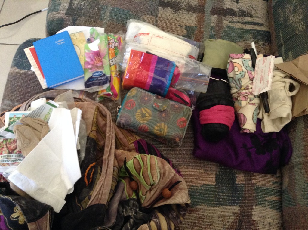 I’m not sure what this collection says about me. Anyone who’s been to our house knows I accumulate clutter. There’s the emergency mask, just in case. Cloth bags for unexpected purchases. I like to have pens and something to write on. A bag of bits and pieces. A shawl/scarf, because I still don’t trust the weather to be consistently hot. And I still have my clear result from my first COVID test, even though that’ll probably be well out of date! One thing I hadn’t realised was how much plastic I carry around, although it’s reusable.