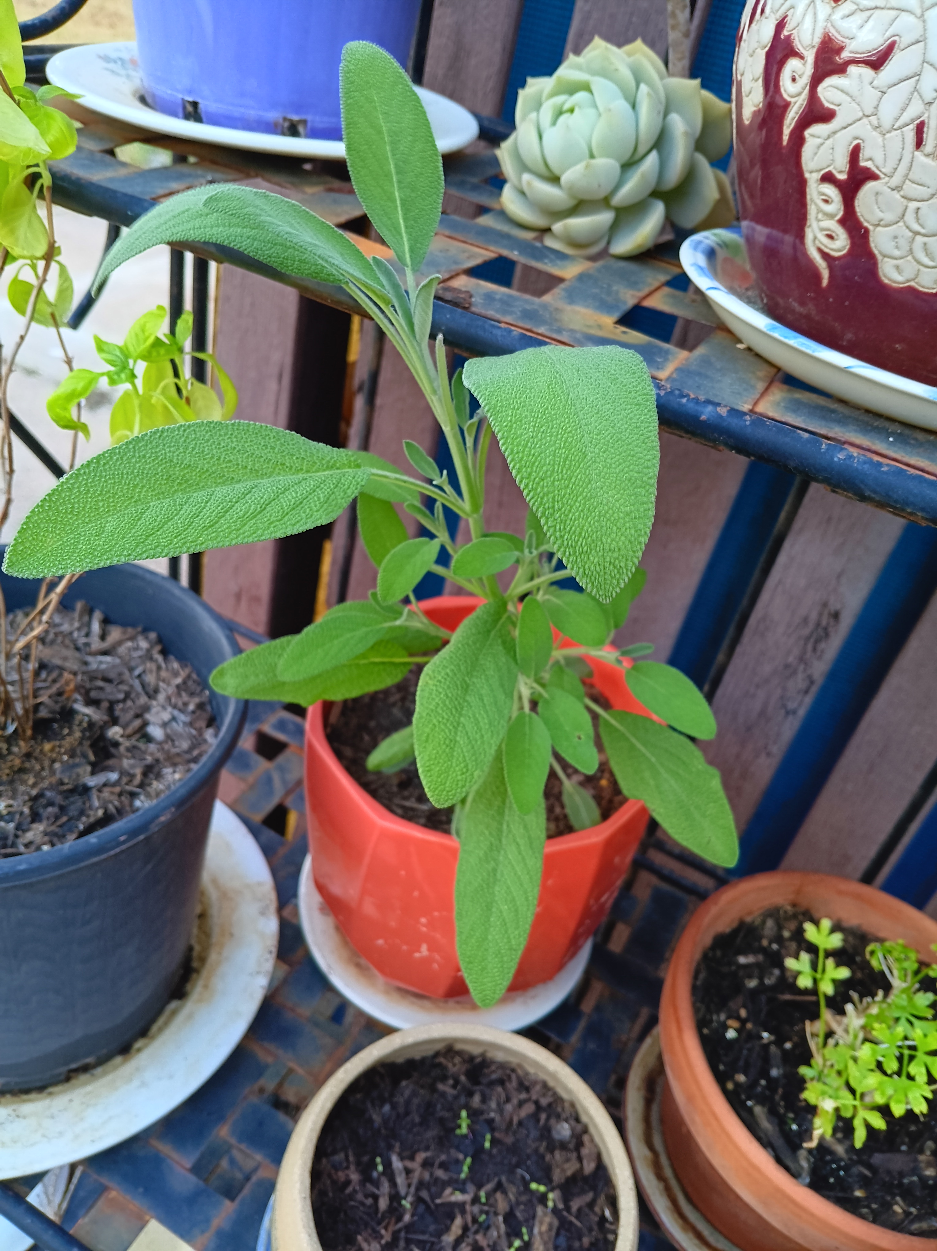 The sage plant, which was just a tiny sprig when I picked it from the garden at church.
