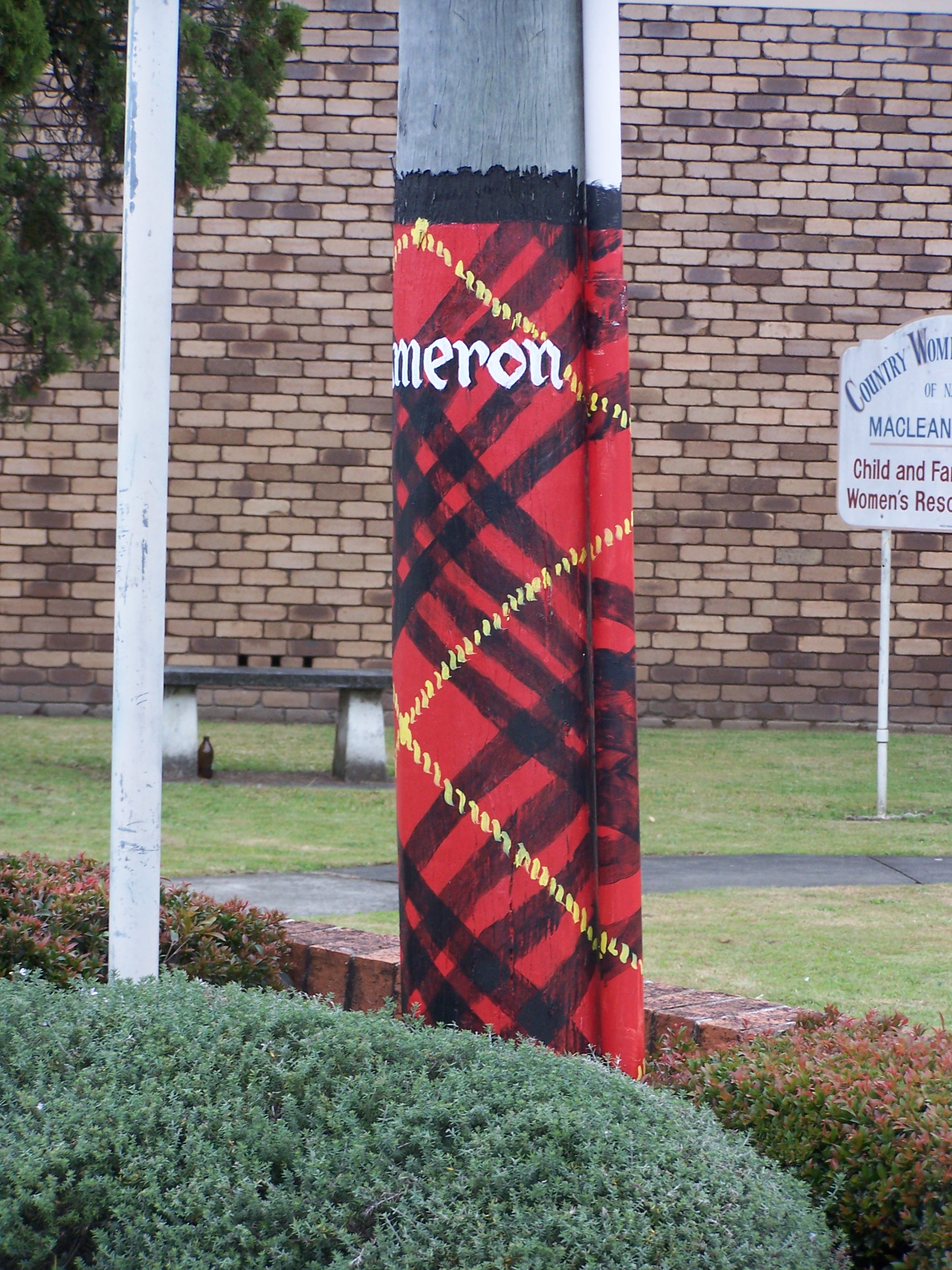 The telephone poles are painted with different clan names and tartans, and there’s a map at the Information Centre/Scottish Shop where you can look up your ancestral clan… here’s mine..
