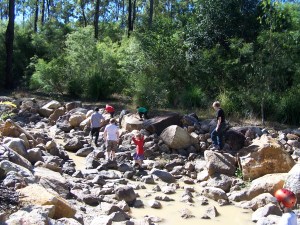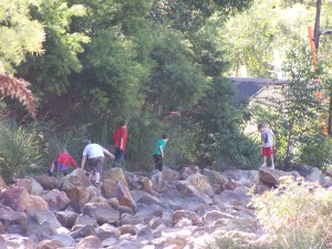 One of the highlights of the day (besides the water play) was the mostly dry stream running alongside the trails. The kids scrambled and climbed along the rocks, testing their “parkour” abilities 😀