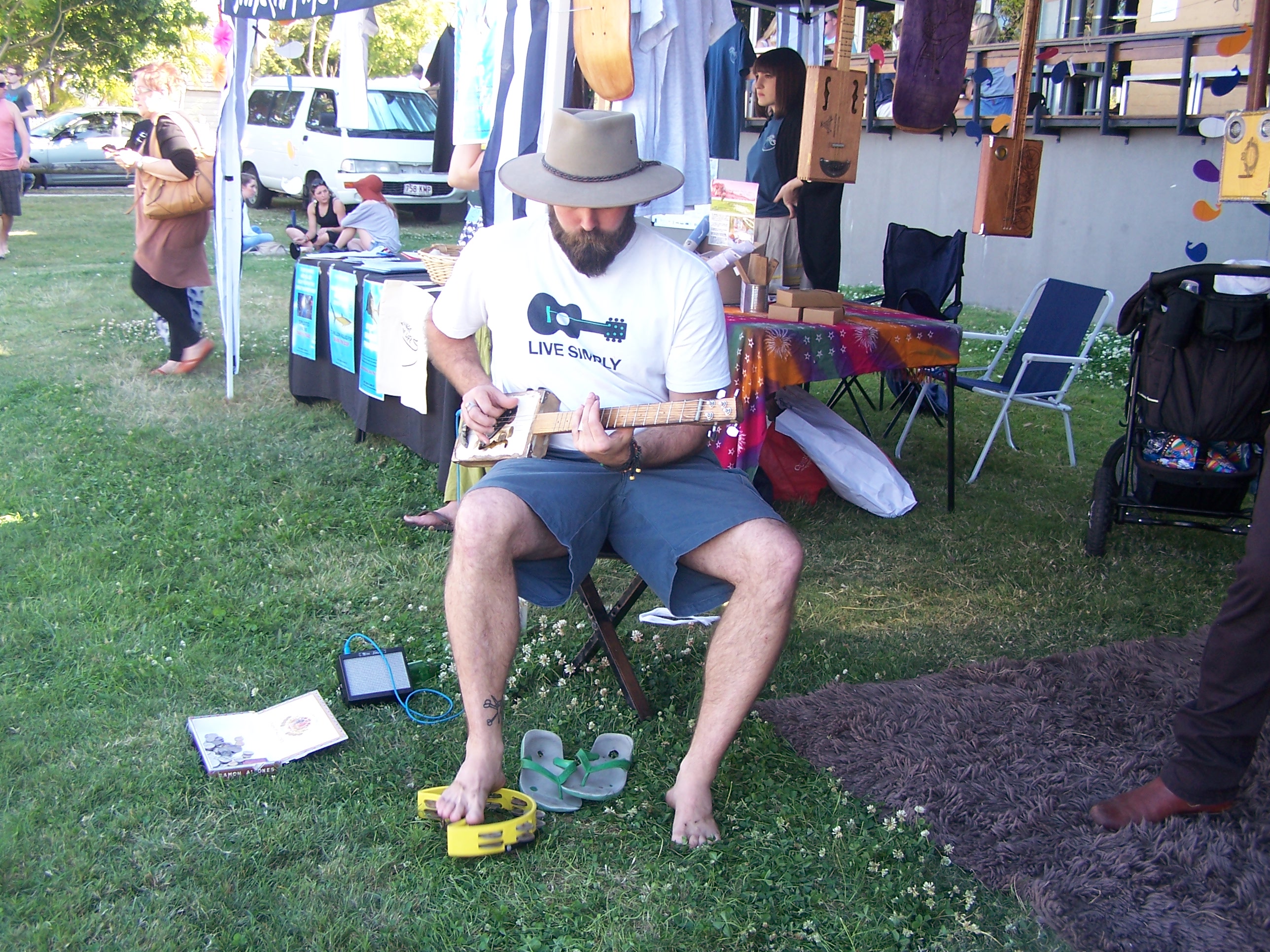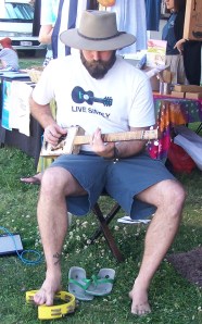 3. Playing a cigar box guitar, with tamborine played with a foot – later a coke bottle slide was used, as well..
