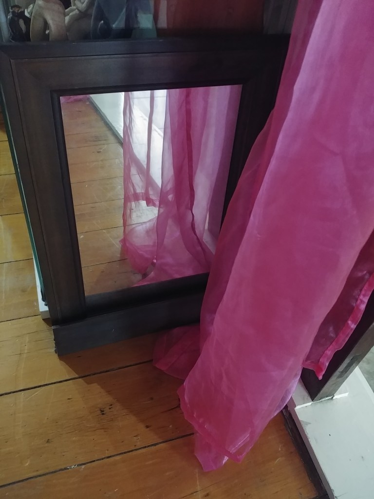 I haven’t found a place to safely put this mirror – the hooks wouldn’t hold it, and I wouldn’t want the glass to smash on our uncarpeted floors. At the moment it’s just reflecting a gauzy, curtain-y dreamscape.