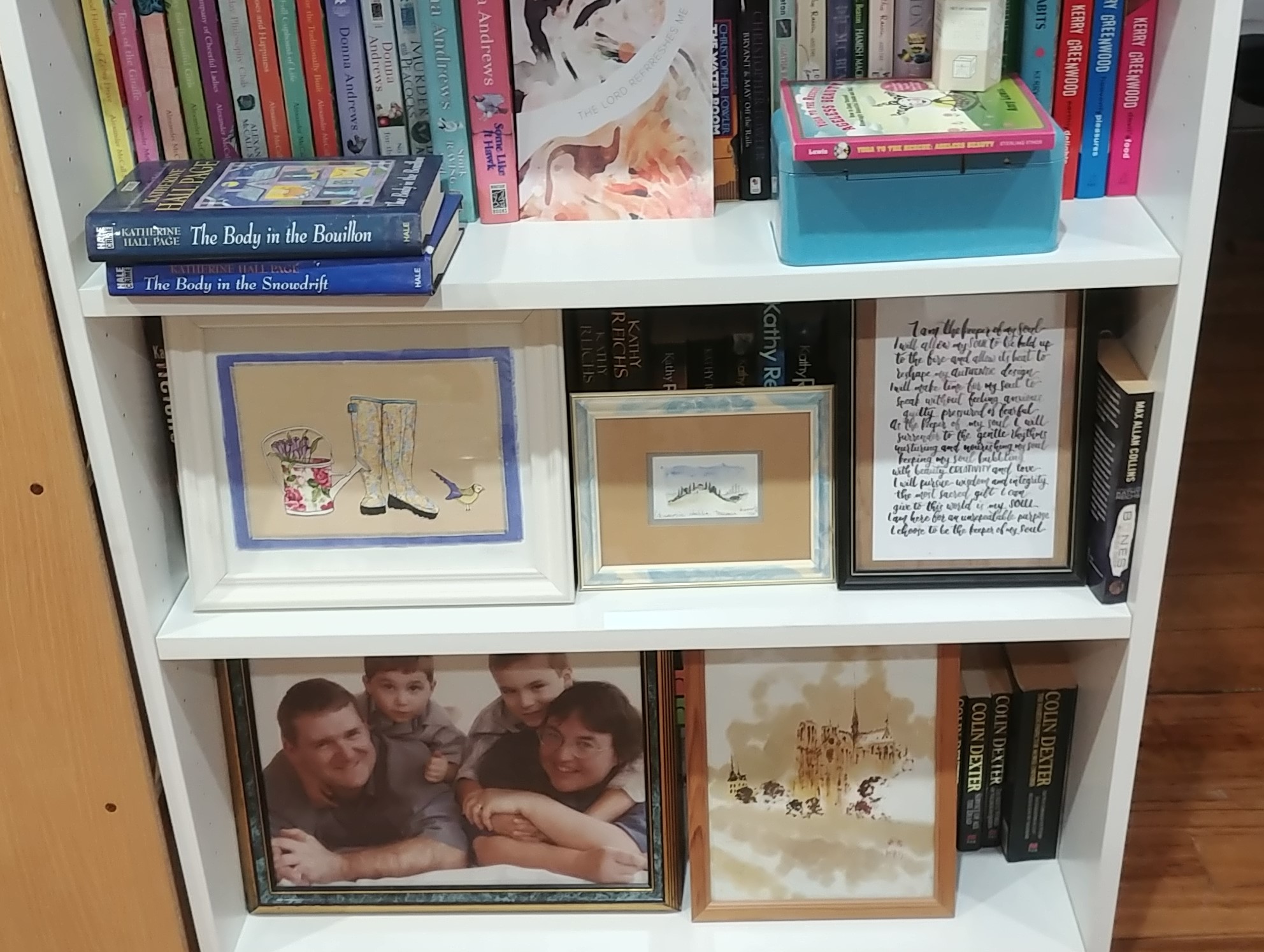 I also found a lovely photo of our family from years ago. It’s sharing space with some paintings I bought while backpacking around Europe in 1994, and a beautiful textile print made by a friend.