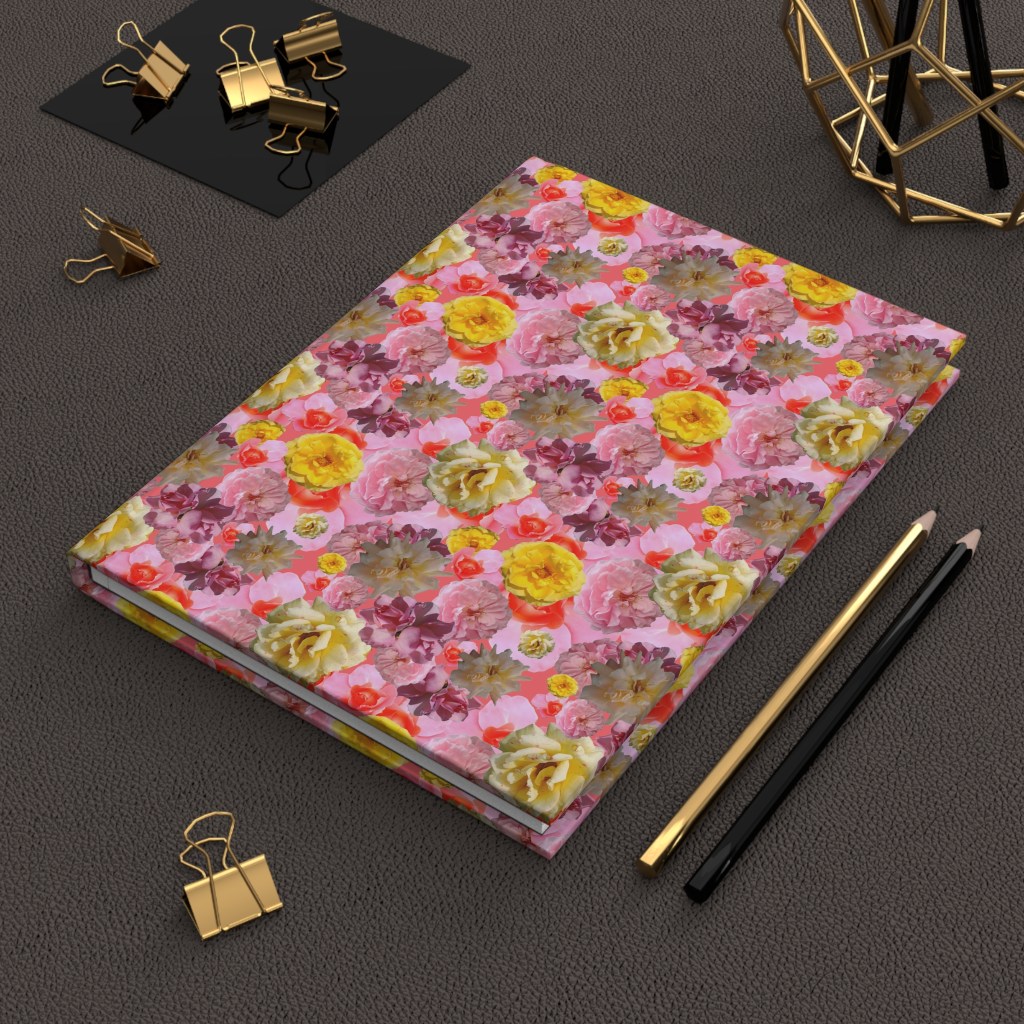 I had to design two repeating patterns (this is the first one), and then present it on an item. No, I don’t actually have this book – the site has mock-ups that you can design and download, and one of the options is to have your design “in context”. I like this one – might even buy the book… The roses are from my photos (of roses from my garden, and a couple from elsewhere).