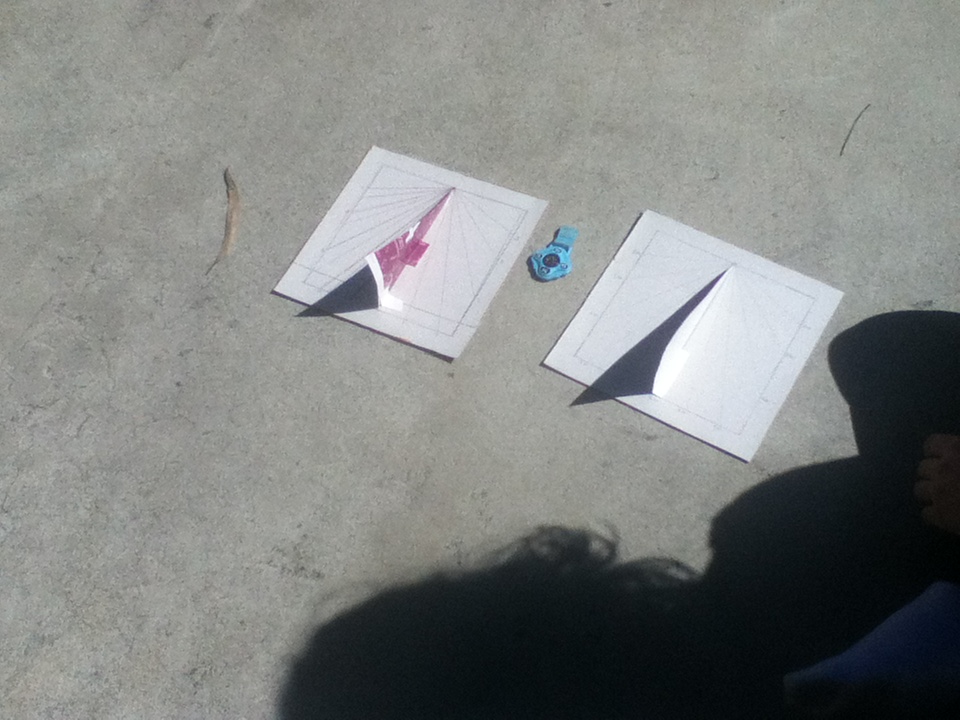 We followed the instructions in the book, and found that our sundials were reading backwards… it seems obvious to me now, but I had forgotten to factor in that we are in the Southern Hemisphere. The book was printed in the Northern Hemisphere, but we needed to turn everything upside-down! π