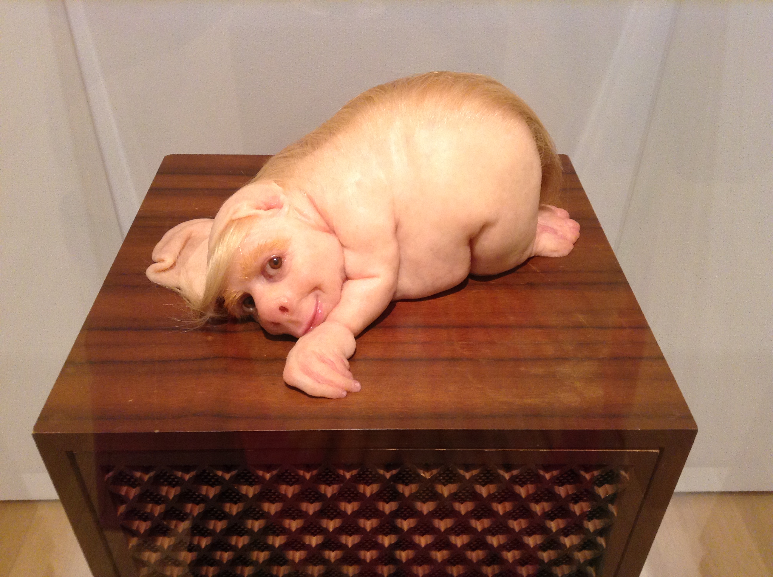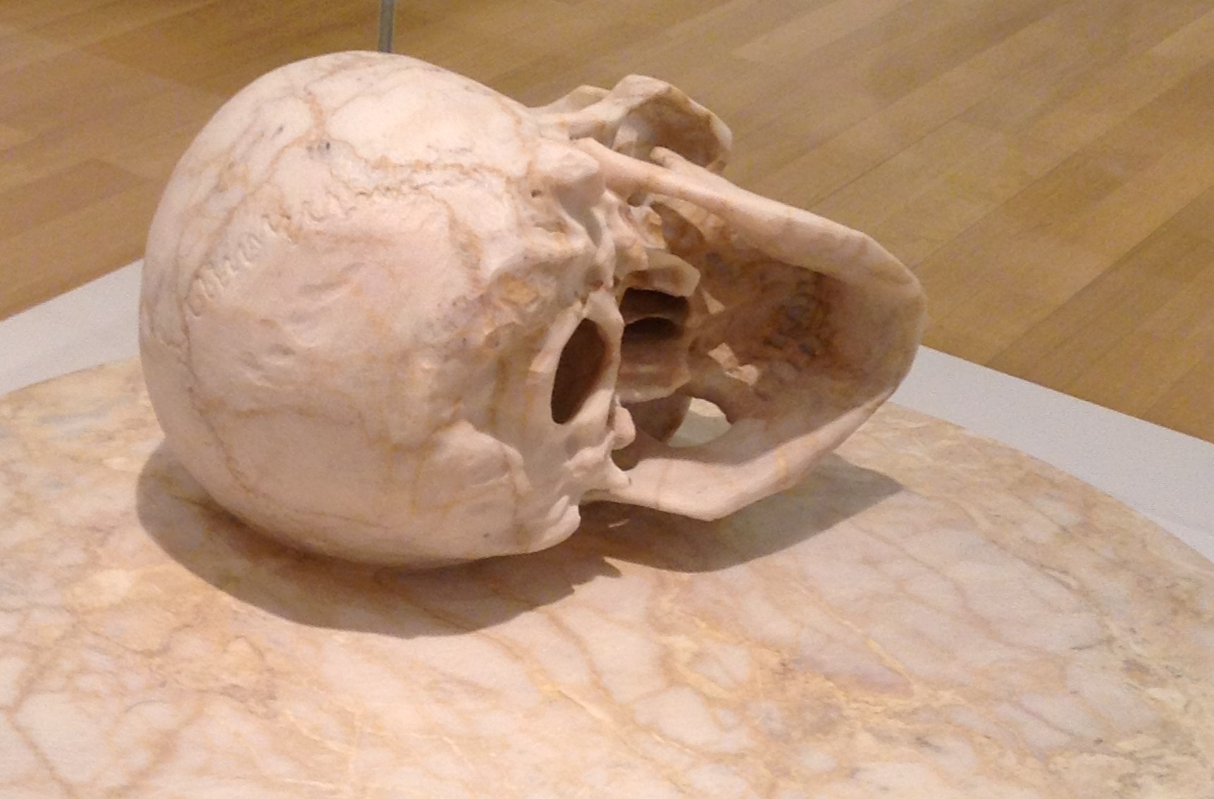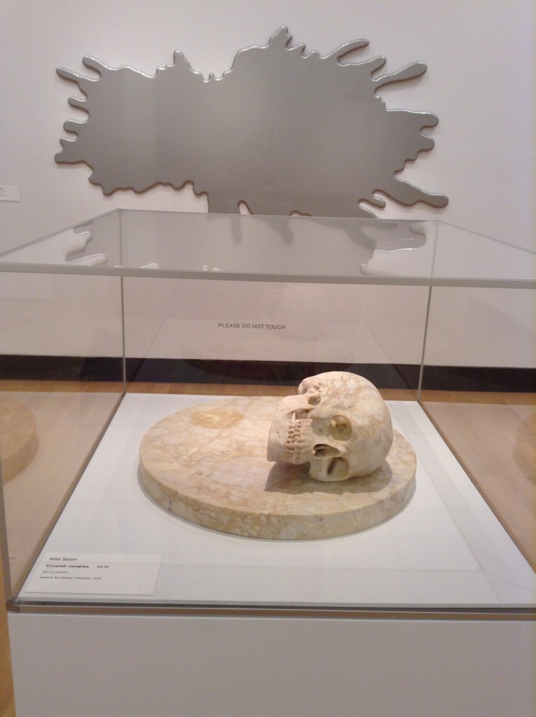 I can’t remember the name of the splat on the wall, or the artist, but the marble in front is “Messiah Complex”, by Alex Seton Look at the anatomical detail in the interior and base of the skull!
