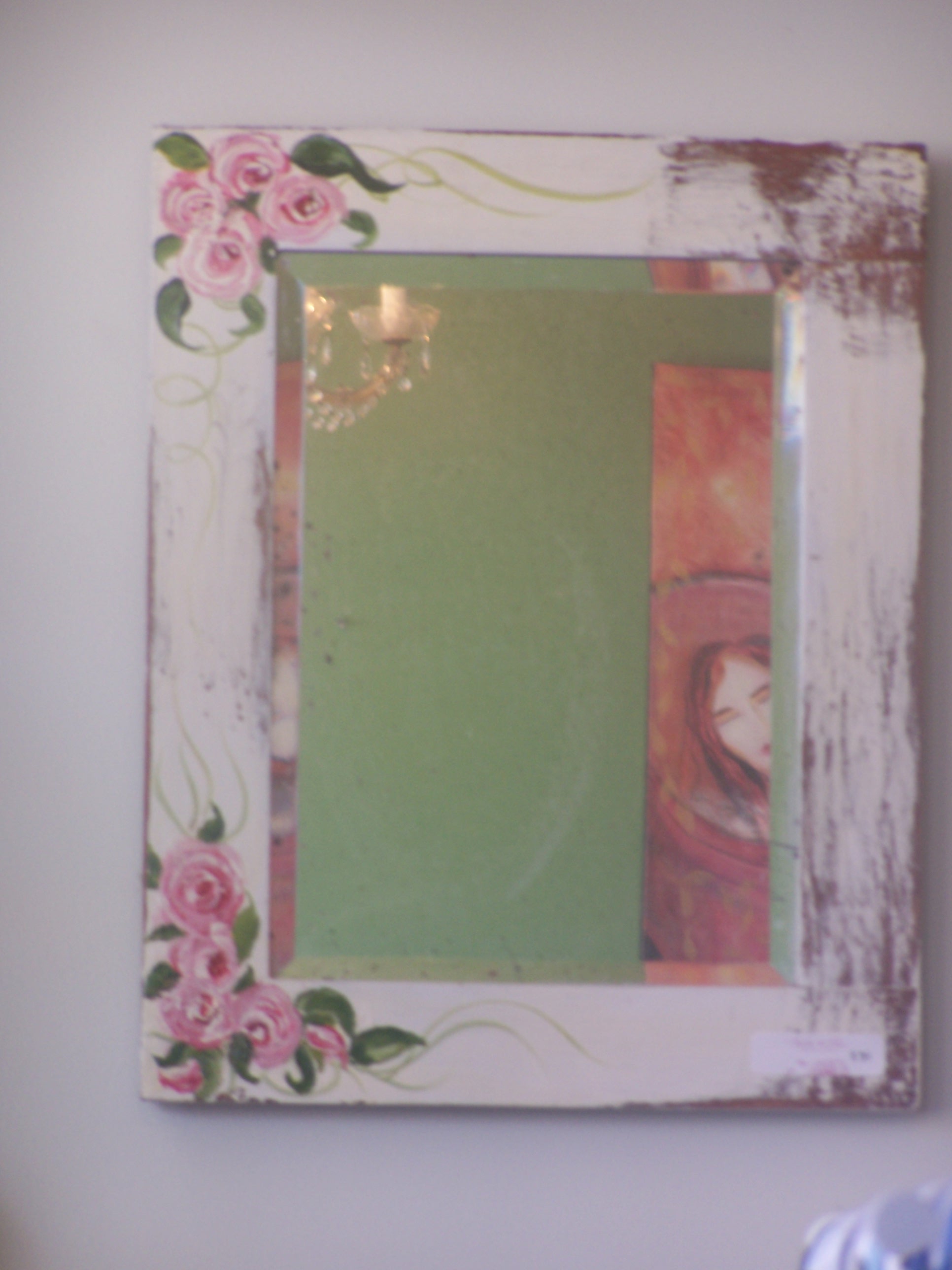 I like to take photos of things that catch my eye… as I was sitting, eating, i noticed that the mirror on the opposite wall caught the reflection of part of the painting on the wall above me – it looked like the woman in the painting was peeking round the frame at us 😀