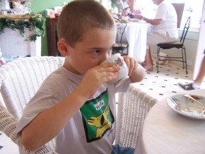 They had English Breakfast tea. They tried it without milk first, then with milk. Littlest boy thought he detected a hint of rosemary, which was interesting. He didn’t think there was a difference with or without milk, though. Biggest boy definitely preferred it with milk!