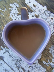 I’m not really supposed to be having it… and I’m only allowed one tablespoon of milk a day. Not quite what I’m used to… I prefer about half a cup of milk in my coffee. No-one else in the house really drinks milk, so we haven’t been getting it, but a friend left a tiny bit in our fridge. I made up my tiny heart cup with half a spoon of coffee and a smidgeon of stevia, and the milk didn’t seem such a small ration. Took it out on the verandah and savoured it… back to the day now! π