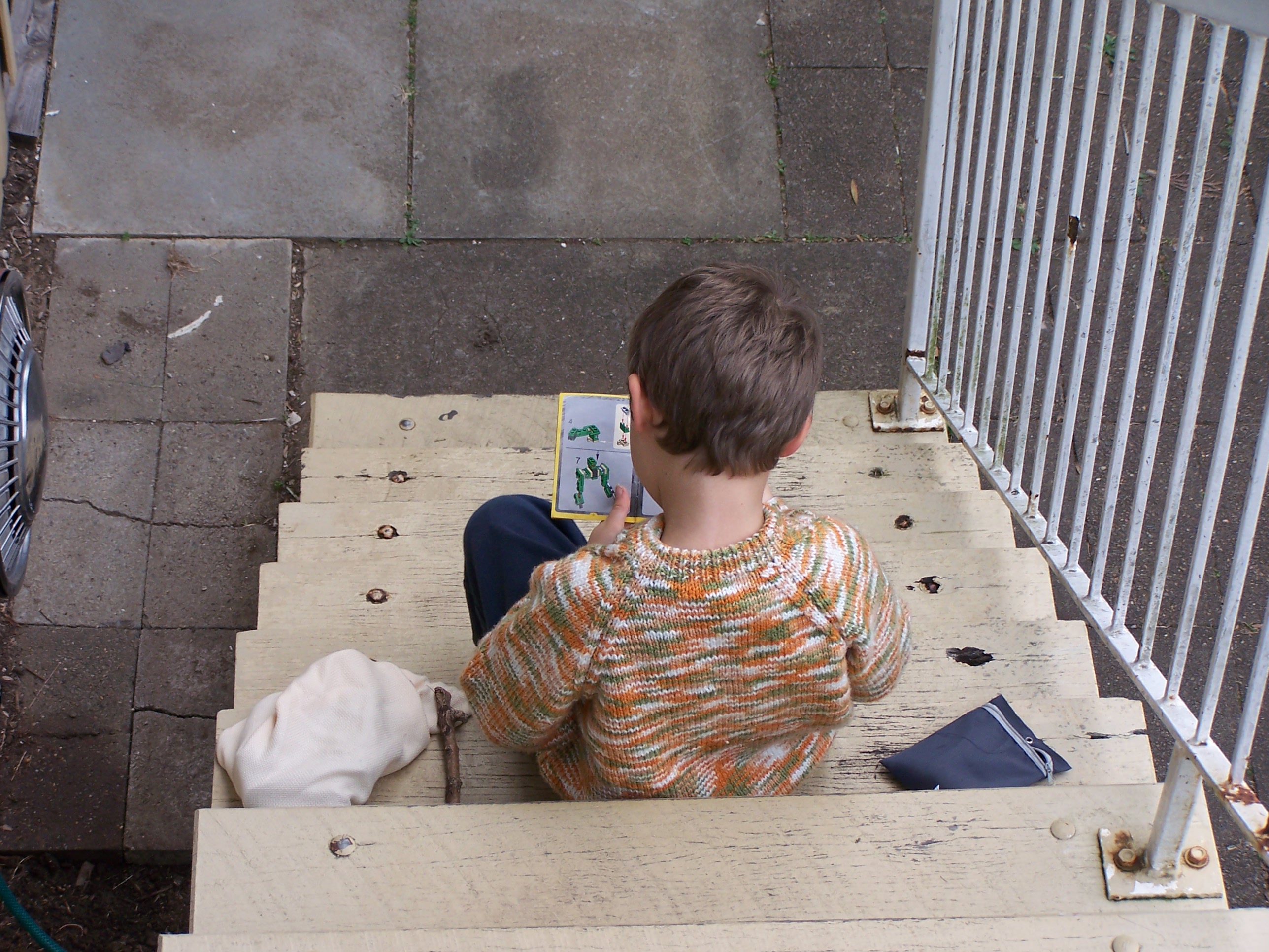 And then he went off on his great adventure, exploring the wilds of the front yard, and spinning amazing stories, as he walked up and down.