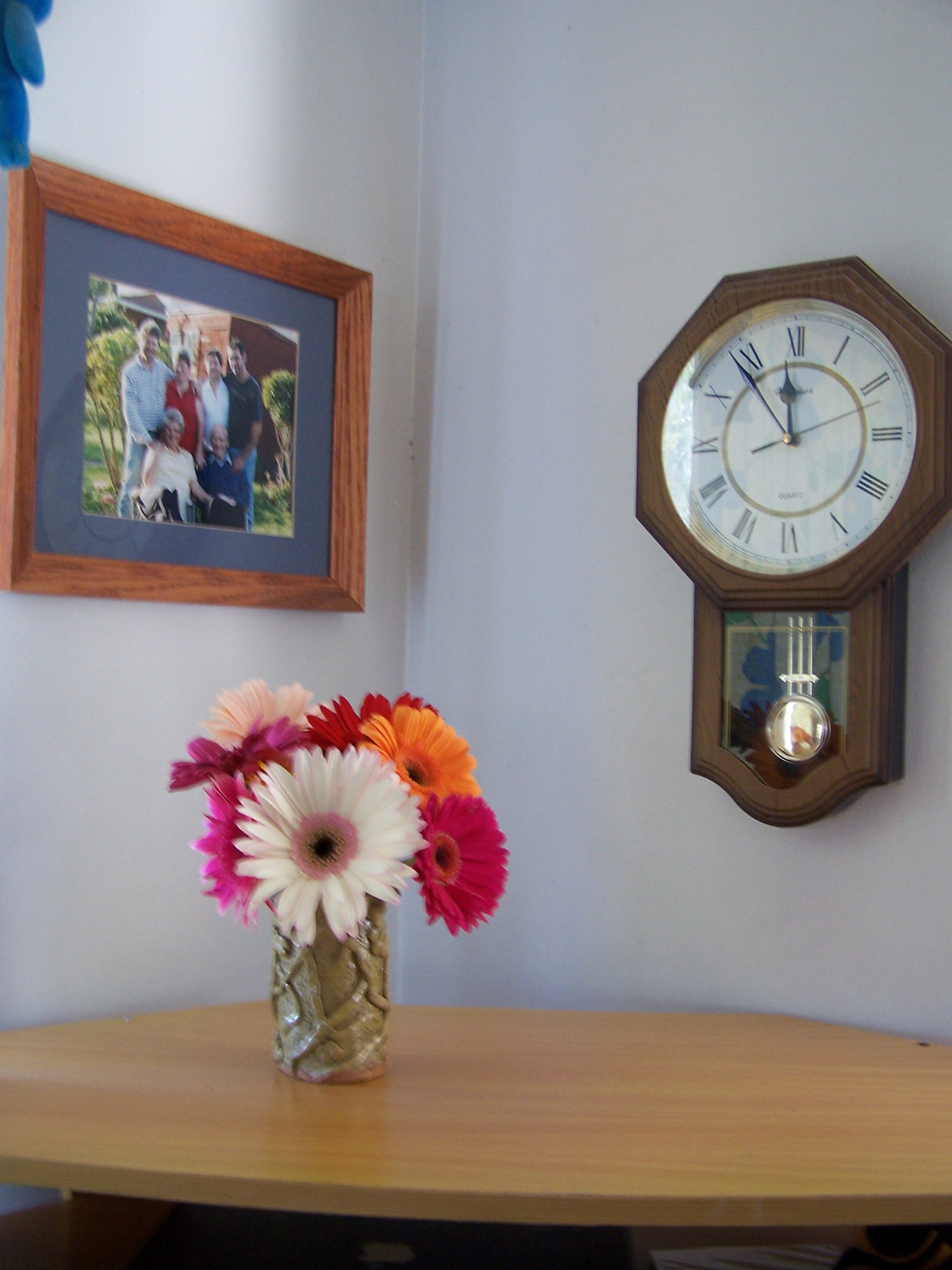 There’s a gap in the corner now, so we’ve put together a corner TV unit we had downstairs.. we’ll use the shelves for… stuff… π and the big “TV” area as a sort of coffee table. I might put my photos out again, on top. At the moment, I’ve christened it with a vase of flowers another friend gave me on Sunday π