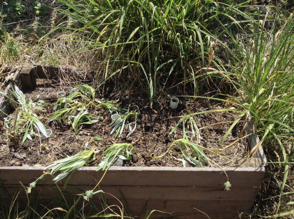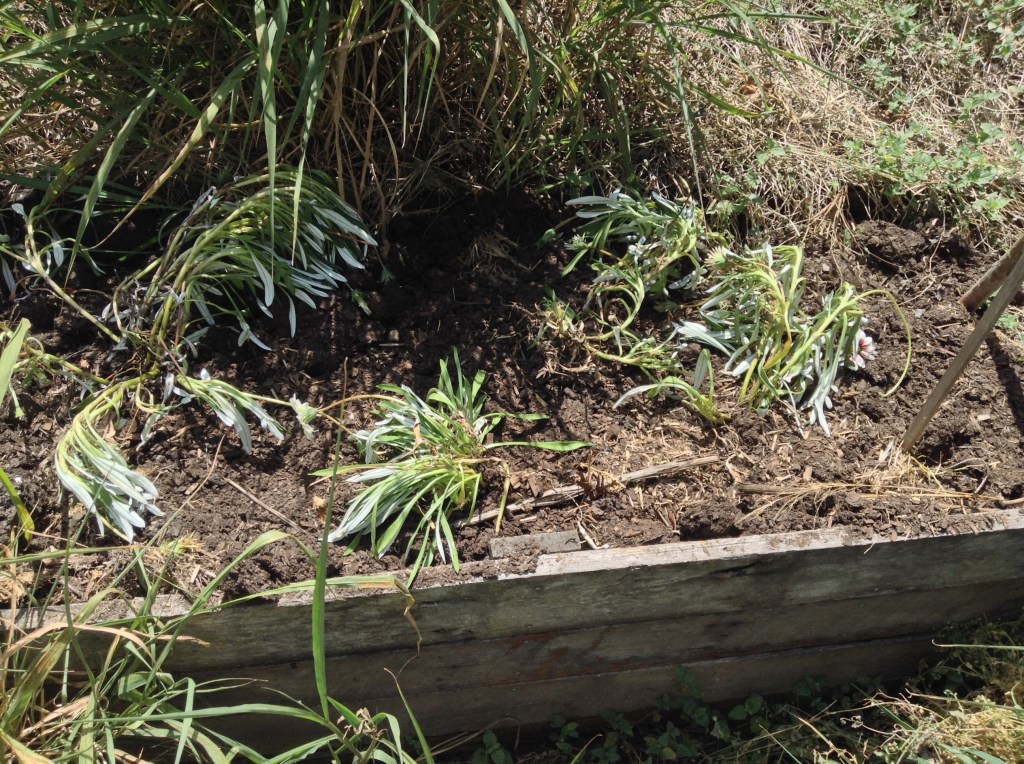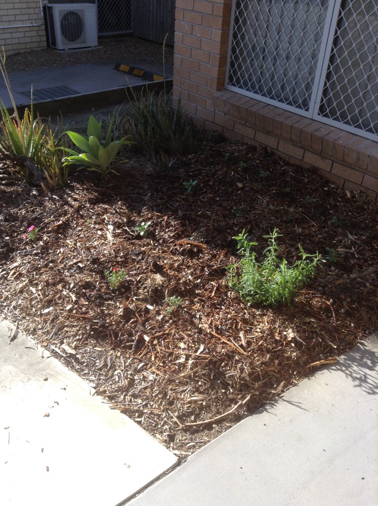 I’m not a natural gardener. Every so often I decide to fill some pots with herbs, or vegetables, or sometimes flowers. None of these have survived. I have some pots full of succulents, but they seem fairly indestructible. The aloe vera is spreading across the front garden. And I do have a large rosemary bush that just keeps hanging on. I just can’t get things to grow in pots. I had decided to give up, after getting tired of seeing the array of dead, dry dirt and sticks in the line of pots out the back. I emptied them out yesterday and swept away the spilled dirt, along with my high hopes for a lovely garden… This morning, though, we got some more plants. I’m going to try just planting in the garden outside the front window – this is where the rosemary and aloe vera is, and seems to be the best bet for survival. We bought a new hose as well, so it’ll be easier to water regularly ๐