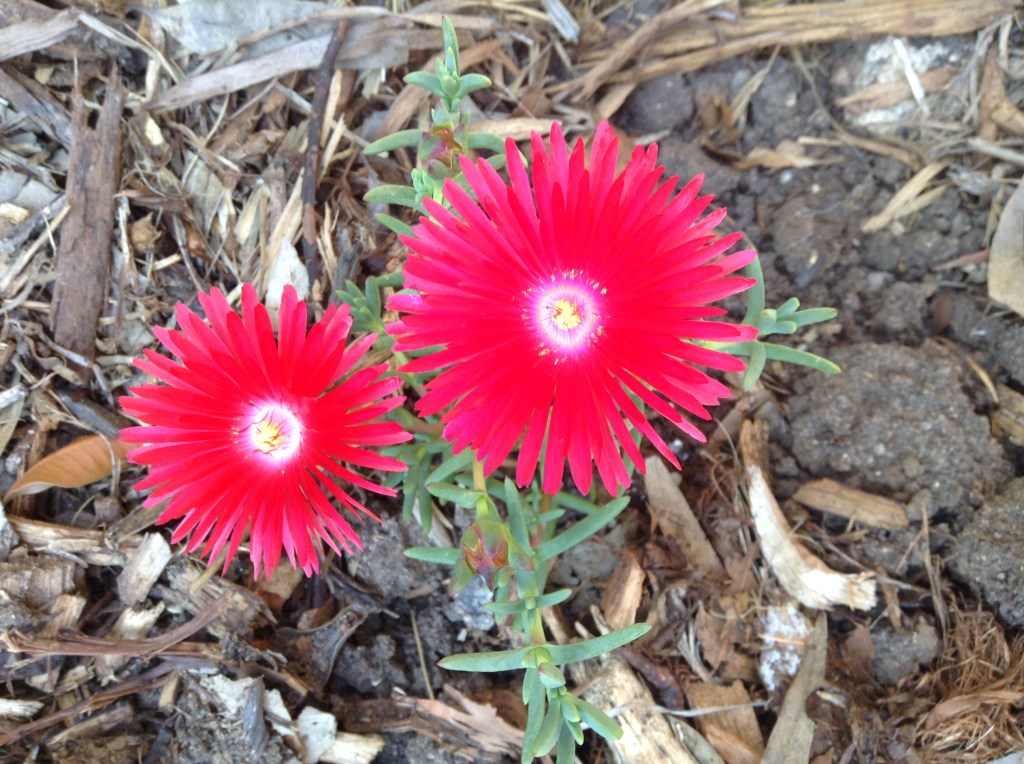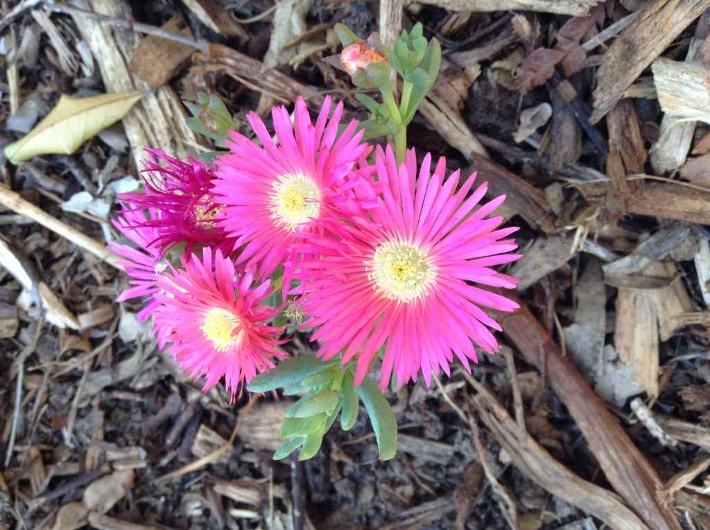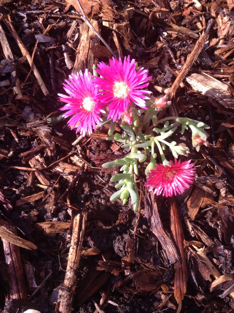 My final choice was a flower I’ve seen in other gardens, but didn’t know its name. I looked round the garden centre and eventually found some. I think it’s a lovely flower – bright, cheerful, just the right size. It also, for some reason, is called “Pig Face”.