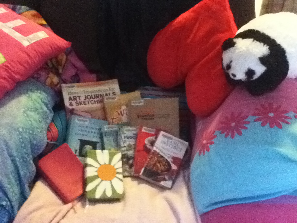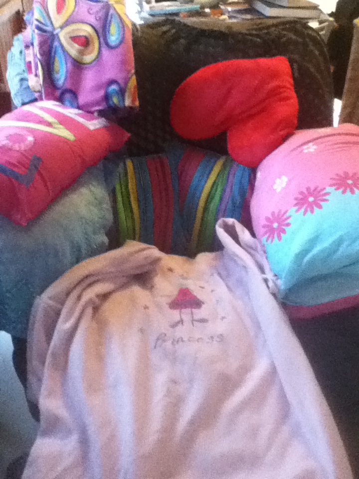 I love being able to snuggle up in a blanket, reading a book… here’s my chair/bed, all dressed up in pink and pillows, with my princess sleeping bag for when it’s too cold. 🙂