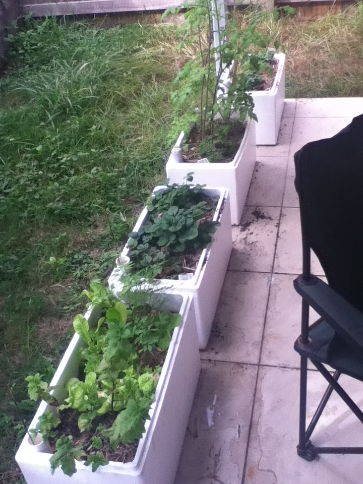Winter probably wouldn’t be the season I associate with “growing”, but our little container garden is flourishing. We have styrofoam growing containers, made to a pattern by Spurtopia.