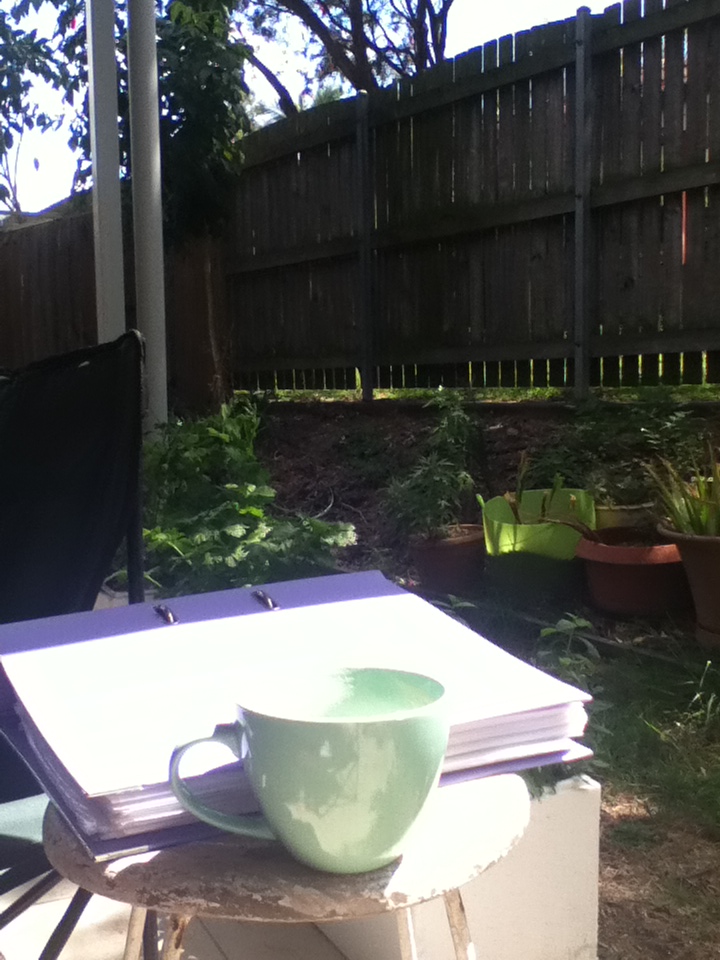 This was my view for most of the day today… I have assessments to finish, so not as much time as I’d hoped to just sit and read books for fun. I had my coffee, though, while sitting in the sun, with my incense sticks smoking away, green things growing and birds singing. One of the most relaxed study days I’ve had in a while!