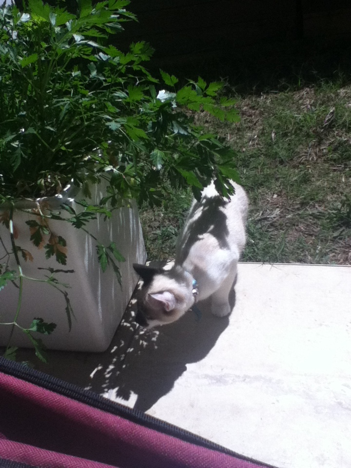 I think it belongs to the neighbours at the back. It’s a bold little kitten, with blue eyes the colour of its collar. Likes scratches under the chin. 🙂