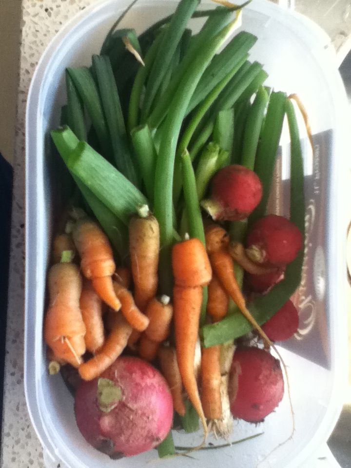 The carrots were a bit weedy – planted too close together. The radishes grew well, and the spring onions were grown from the ends of store bought ones. We have quite a few of those.