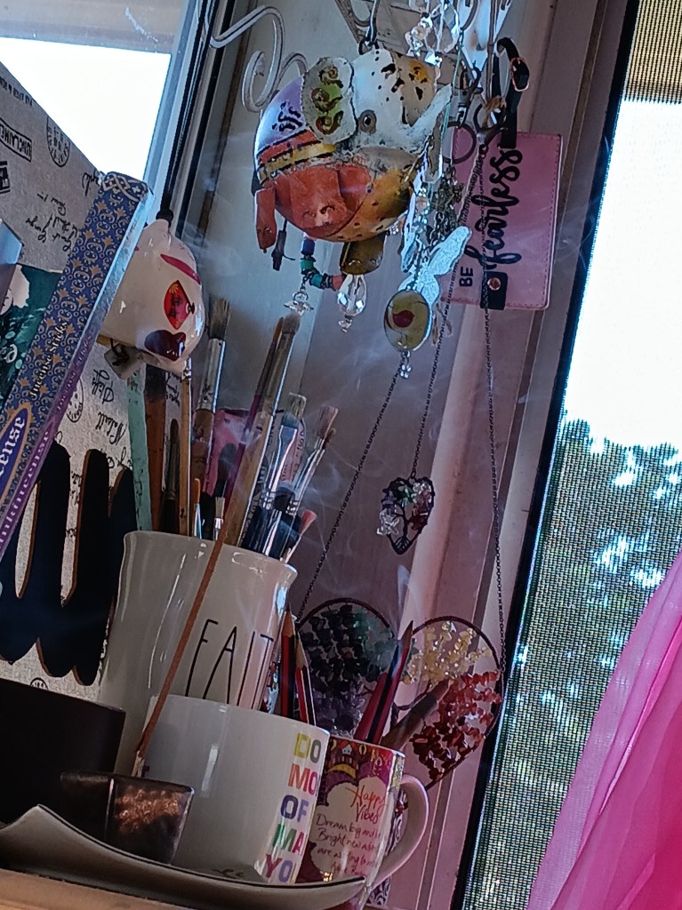 I spent most of the afternoon in my cosy chair in the art room, with the windows open, an incense stick burning, and looking through papers while listening to old CDs.