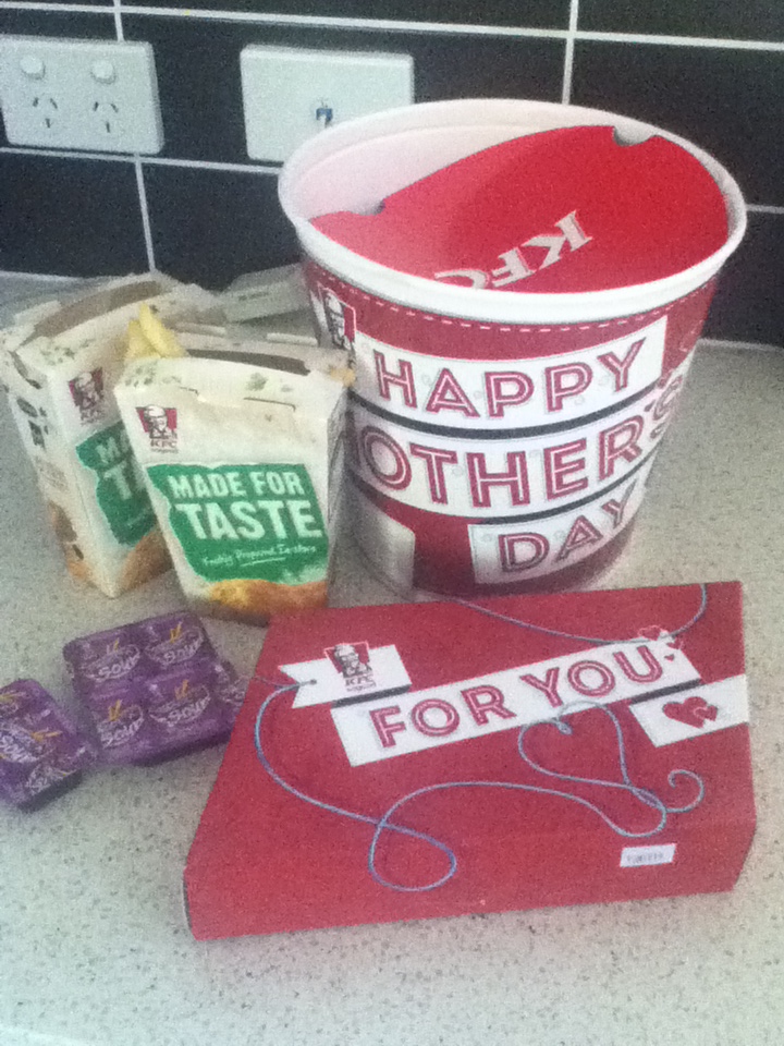 Today is Mothers’ Day in Australia… I’ve had a lovely day. Hubby and I have both been ill in bed through the week, but were able to get to church today. My sweet beans gave me pressies, and a hand drawn card fromย little Bean. I would have liked to post a photo of them both, since I’m only Mum because of them ๐ Neither of them are too happy about public photos though… (and I forgot to ask before they went to bed!)