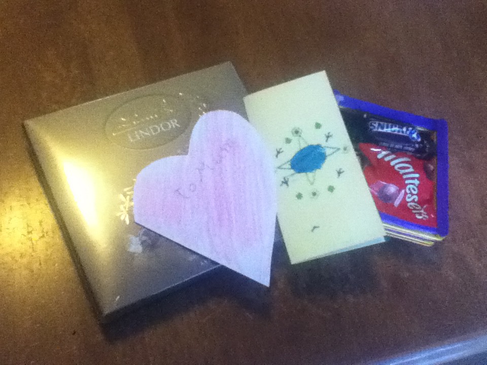 I was woken up this morning by smiling (sleepy) boys – I knew I would get some choccies but was surprised by homemade cards, too. โค