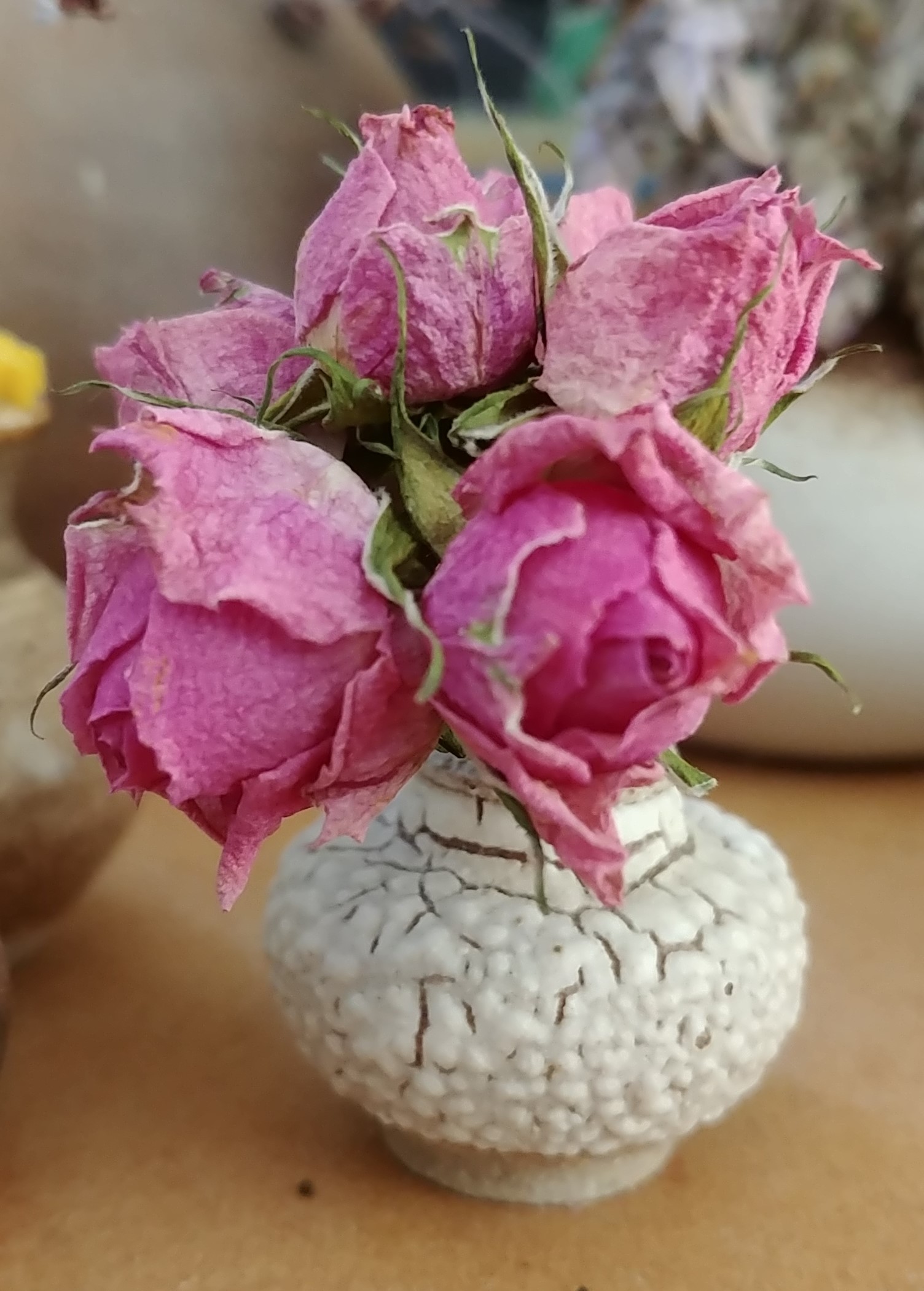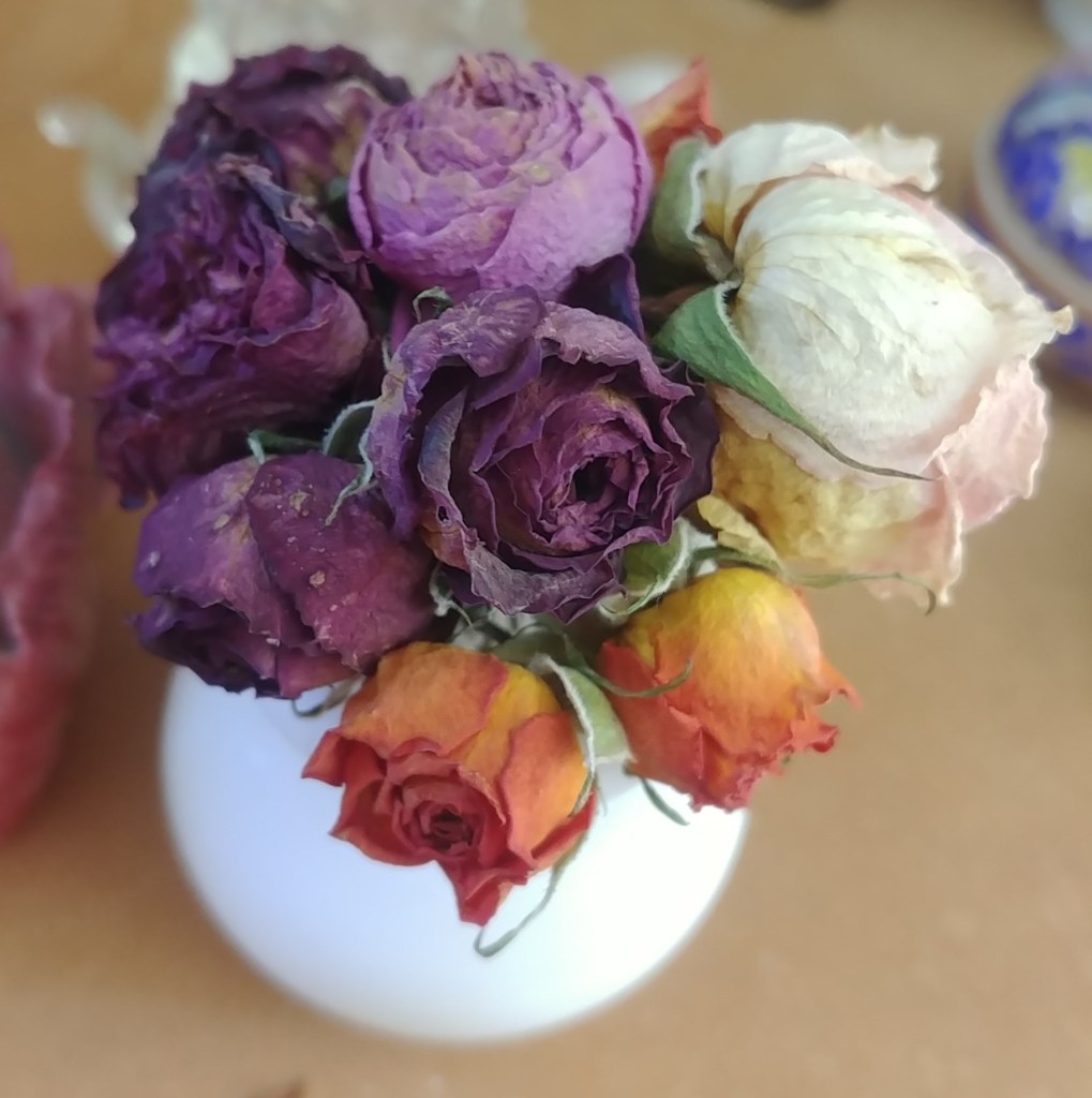 That vase is probably only a couple of centimetres tall, so that gives you an idea of how big the roses are. They’re among the remains of a bunch of roses I was given a while back. I find that if I leave them in the vase, they will dry quite nicely. Often the big roses don’t dry as well – they lose their colour and can start to get mouldy. The tiny buds and miniature roses dry better, and can keep quite vibrant colour.