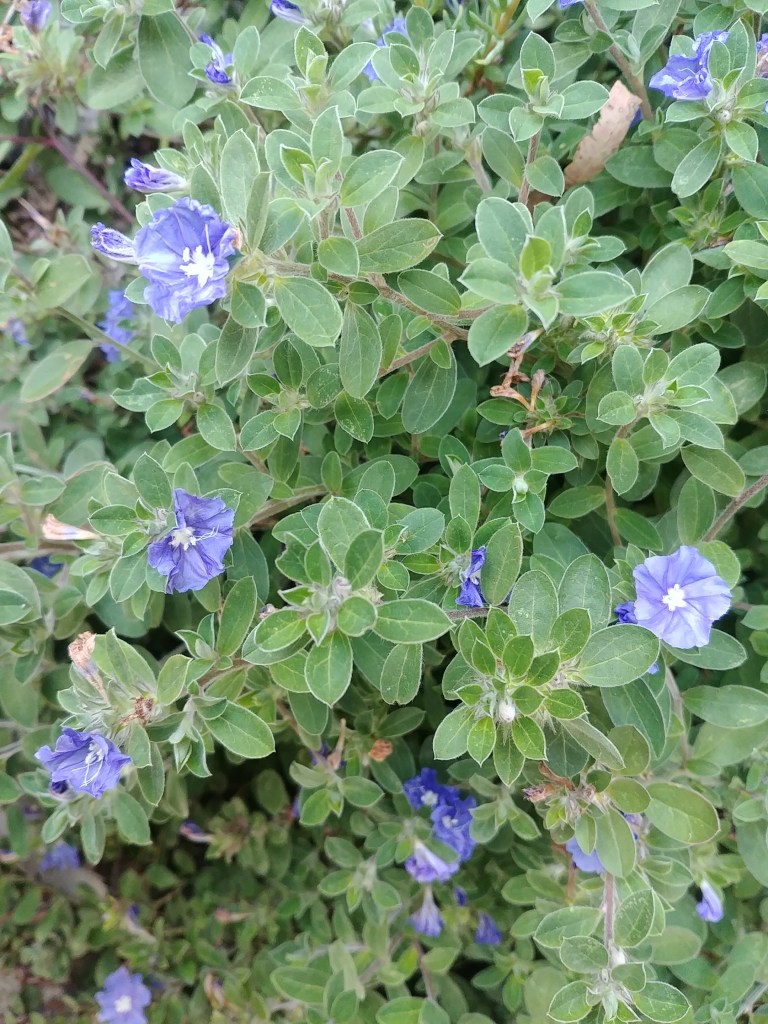 I don’t know what these are called, but they turn up bright and cheerful each year, whether I remember to water them or not.